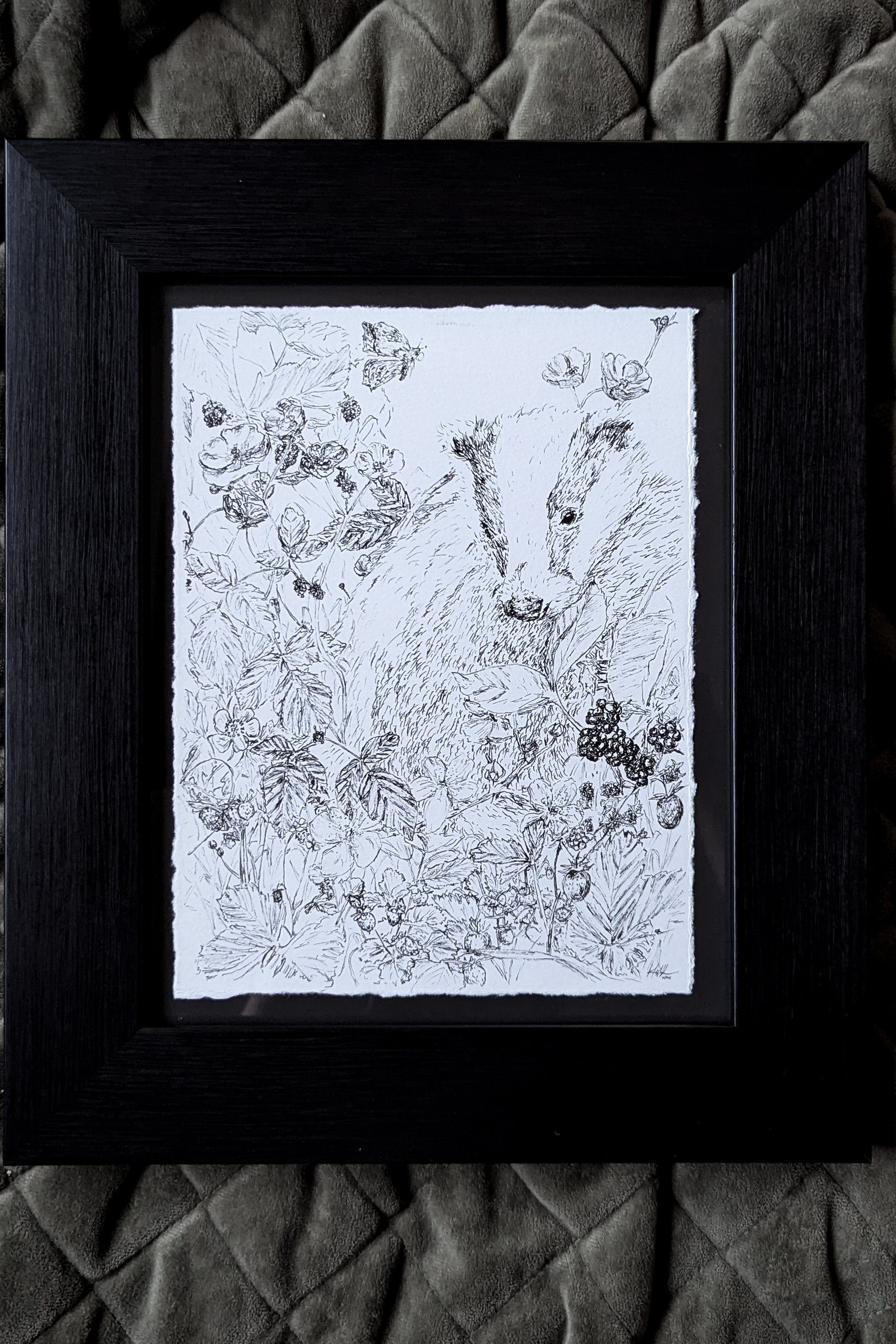 A badger, with painted lady butterfly, amidst a bramble of blackberries, wild strawberries, and buttercups.