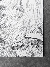 This piece was a pleasure to lose myself in. Inspired by the Pacific Northwest, this grizzly takes center stage, resting on a bed of Sitka spruce, Western red cedar, and Douglas fir boughs. Look to the corner and you'll find a small friend in a deer mouse, hiding under cover of rainbow chanterelles - no doubt halted in the middle of foraging its next meal.