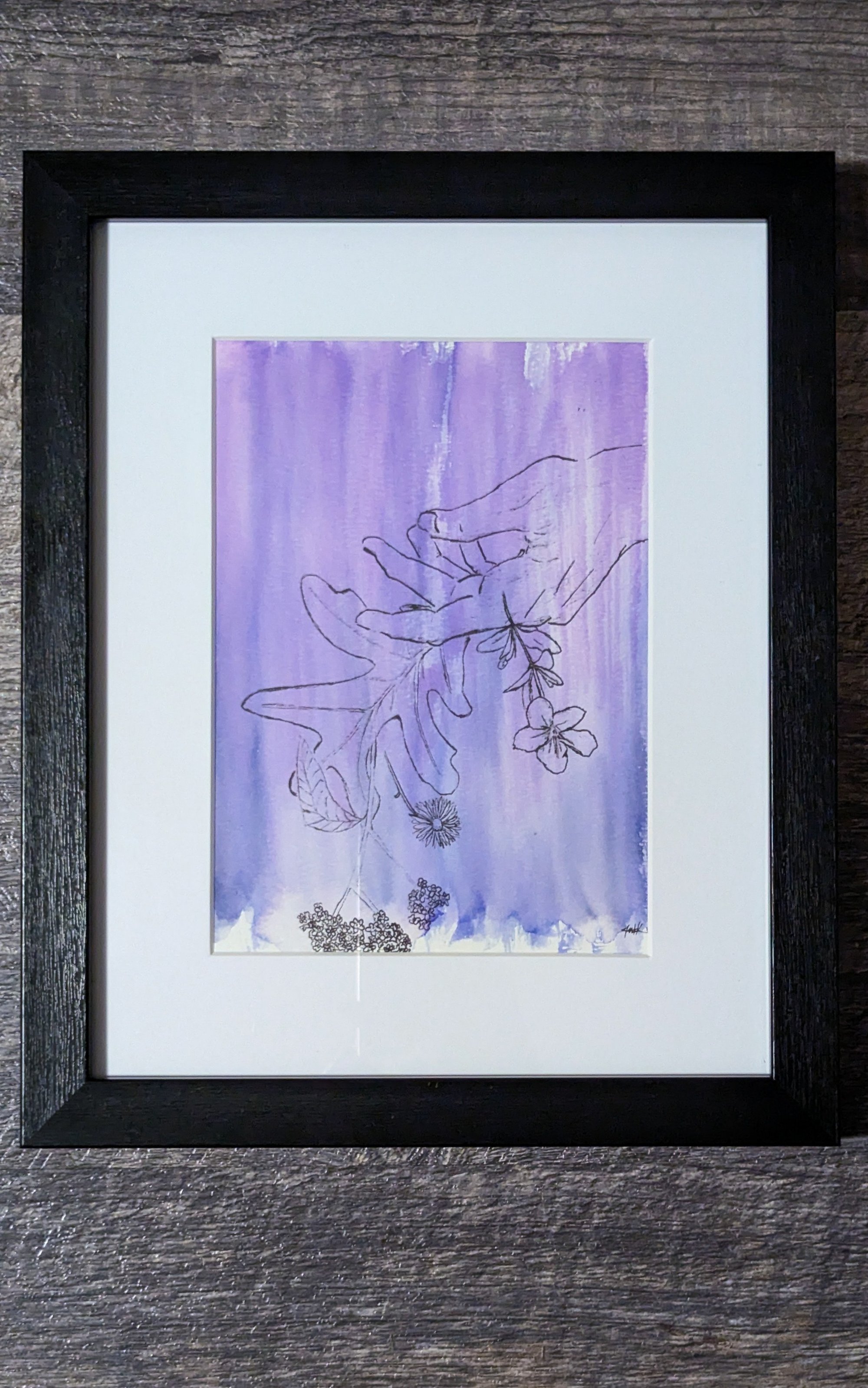 Inspired by plant symbolism, in this piece I wanted to make sure I chose the flora intentionally. Daisies represent innocence. Heliotrope represents devotion. Oak leaves are said to symbolize bravery. And petunias, here a wild petunia, are where it gets complicated. I chose them for symbolizing soothing presence, or a desire to be near someone who calms and comforts you. However, they also can symbolize resentment or hot anger. Finally, somehow, they can also represent the refusal to give up hope. To me, ultimately, this combination of meanings was everything. I wanted the flowers, and leaves, to represent what I think so many seek in times of difficulty.