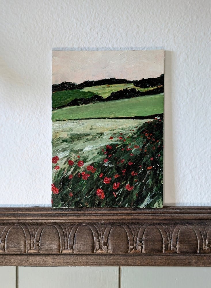 A textural landscape, featuring rolling, hedge-lined fields of tall grasses and nostalgic red poppies.