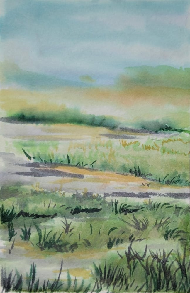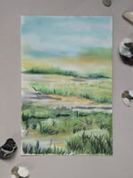 A soft, riparian landscape follows a marshy waterway as it fades into the mist.